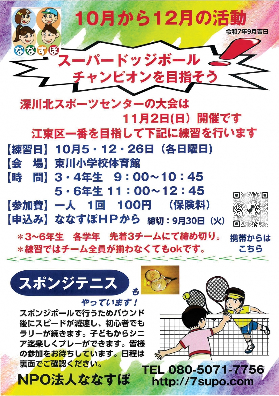 12月6日(日)、深川北スポーツセンターで2015深川北小が規制学年別スーパードッジボール大会が行われた。各学年熱戦が繰り広げられたが、その中4年生の部で、ななすぽで練習した扇橋小学校の「モンスターズ」が見事優勝!!。来年2月に行われる江東チャンピオンズリーグへの出場が決まった。4年生は最多の14チームが参加。リーグ戦は2戦全勝、決勝トーナメントでも、強いといわれた元加賀小学校の2チームを破っての優勝だ。チャンピオンズリーグでも頑張ろう!!他の子供たちも頑張ったのだが、レベルが高く勝ち抜くことができなかった。指導者として、指導力UPに努め。また来年挑戦だ!!